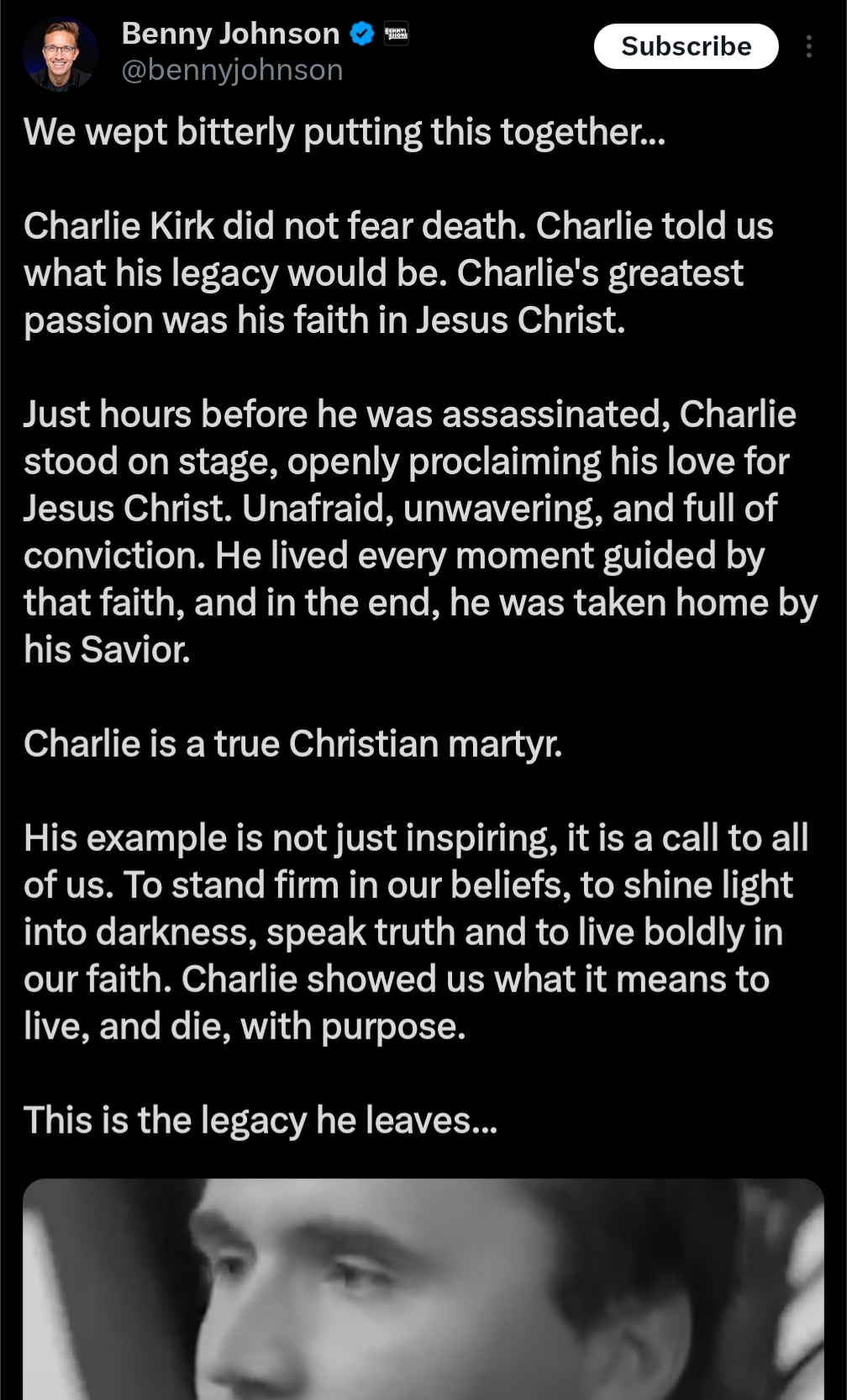 His example is not just inspiring, it is a call to all of us. To stand firm in our beliefs, to shine light into darkness, speak truth and to live boldly in our faith. Charlie showed us what it means to live, and die, with purpose.